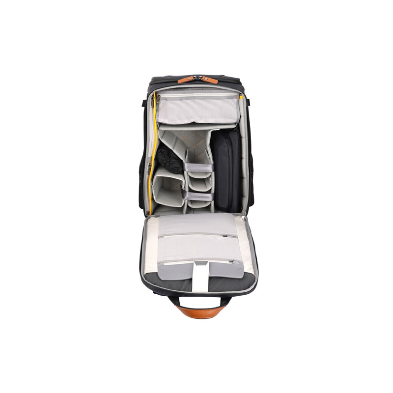 Ba lô này có nhiều ngăn, bao gồm hai ngăn lưới có khóa kéo ở bên trong nắp trước, một ngăn khóa kéo bên trong, một ngăn kín đáo phía sau bên dưới chỗ để móc vali kéo, và một ngăn chống trộm RFID ở nắp trên. Ngoài ra còn có một ngăn có thể mở rộng trên dây đeo vai.